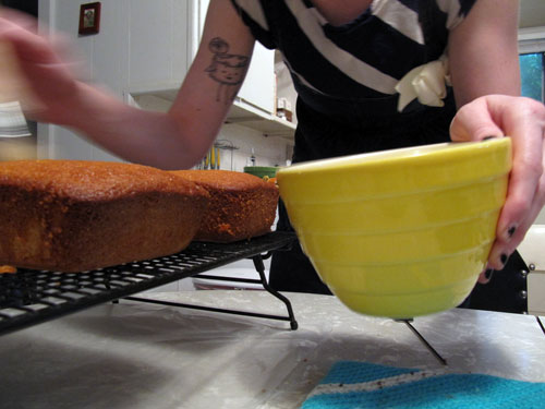 - Make the cakes! Center a rack in the oven and preheat to 350ºF. Butter two loaf pans, dust the insides with flour and tap out the excess. Even if they are nonstick, it’s still good to grease them, just to be sure! Place the pans on a baking sheet.