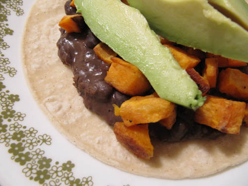 - Assemble open-faced tacos by topping your tortillas with a generous amount of refried black beans. Top with roasted sweet potatoes, avocados and goat cheese (or whatever cheese you have on hand).