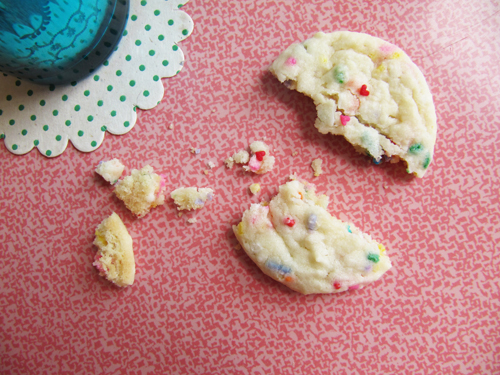 - Using a cookie scoop or a spoon, scoop dough onto the prepared baking sheets about 2 inches apart. Sprinkle with more sprinkles if you want to and then bake until very lightly golden on the edges, about 8-9 minutes.